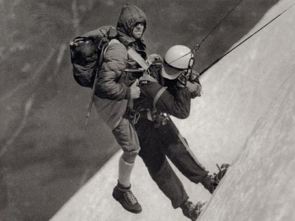 Claudio Corti sulle spalle di Alfred Hellepart durante il salvataggio del 1957.UKC Articles, Feb 2010 © Albert Winkler (Archive Carlo Caccia)