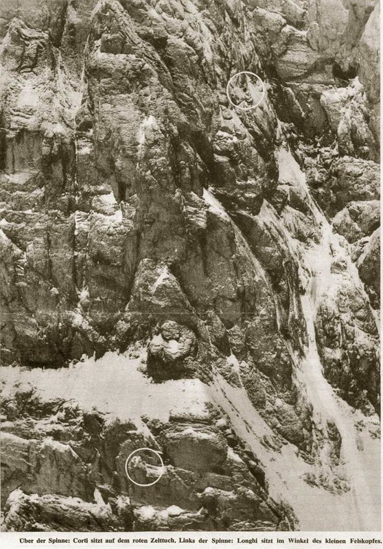Poco dopo, Corti fu colpito da un sasso, che lo mise fuori uso. Nothdurft e Mayer, che avevano bisogno di muoversi velocemente per avere qualche possibilità di giungere in vetta e scenderne sani e salvi, lasciarono il loro materiale da bivacco a Corti (tra cui la tenda rossa), mentre Corti diede ai tedeschi la sua attrezzatura da scalata. Si separarono e quella fu l’ultima volta che qualcuno vide Nothdurft e Mayer vivi. Corti combatté per la sua sopravvivenza per quattro giorni, rannicchiato nella tenda da bivacco rossa su una piccola cengia, 250 metri sotto la cima.