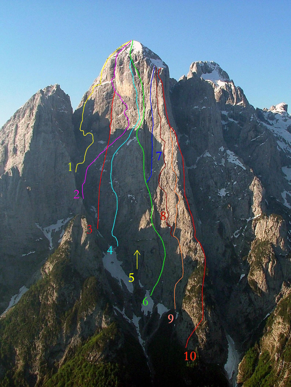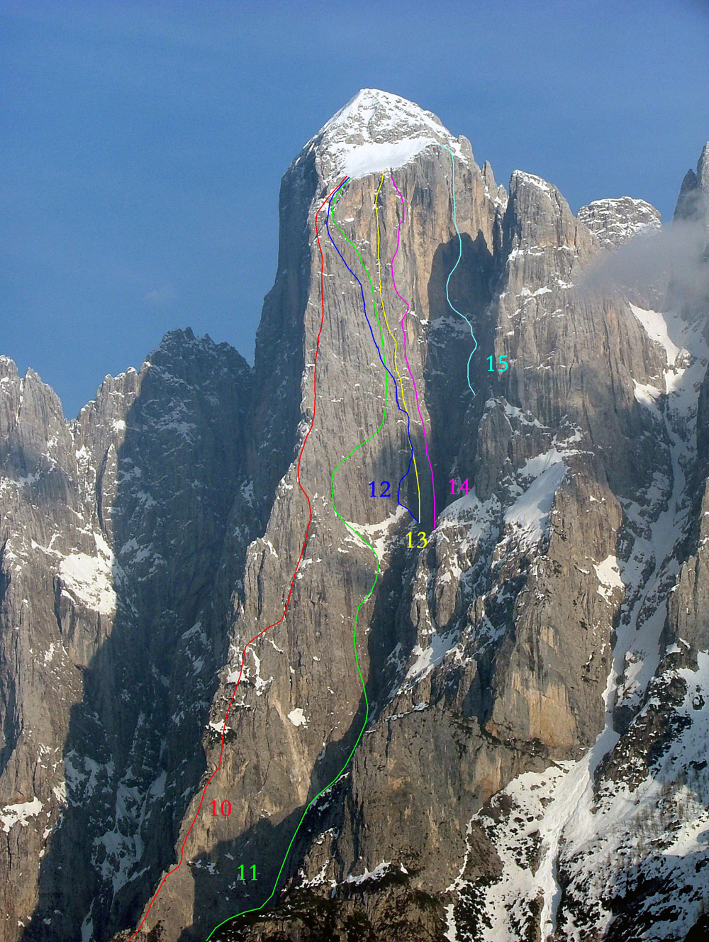 - La storia infinita. Miroslav e Michal Coubal, 12-15 luglio 1990, 1350 m, VIII-. Salita estremamente impegnativa, continua nell’impegno richiesto e mai ripetuta, che percorre l’ampia parete compresa tra la Jori e la Messner-Holzer. Alcuni chiodi sono presenti sulle lunghezze più difficili, ma complessivamente la via risulta poco protetta. L’uscita avviene lungo placche verticali e nerastre poste a destra del grande e strapiombante scudo giallo. Secondo i primi salitori, il tratto chiave sembra proteggibile anche utilizzando alcuni spuntoni naturali. La roccia è complessivamente buona. Prevedere almeno 1 bivacco in parete.