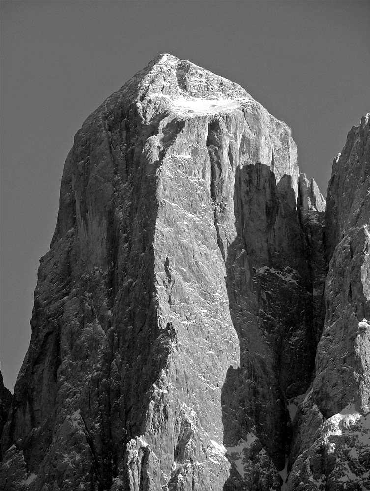 - Messner-Holzer (o Sudtirolesi). Reinhold e Gunther Messner e Heini Holzer, 17 e 18 agosto 1967, 1400 m, VI, A2. Bellissima e davvero ambita salita, abbastanza ripetuta, ben più impegnativa della “Jori”. Sale prima lungamente verso destra, poi verticalmente per placconate e poi verso sinistra, fin quasi alla base del grande scudo giallo e strapiombante, da cui si prosegue lungo la serie di fessure alla sua sinistra. Questo ultima, impegnativa, sezione risulta spesso bagnata e può essere evitata salendo verso sinistra gli ultimi tiri della via del cuore. In questo modo però si evita la parte più caratteristica dell’itinerario. Sono presenti alcuni chiodi nei tratti più impegnativi.