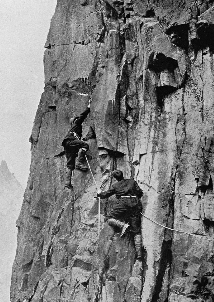 Lily Bristow, "La fessura Mummery", 1893. Con l'incastro della gamba destra, Mummery sta superando la sua celebre fessura e Lily Bristow scatta dal Portail  du Charmoz questa immagine, esemplare tanto per la storia che racconta, quanto per l'esatta identificazione del passaggio (A.F. Mummery, “Mes escalades dans les Alpes et le Caucase”, L. Laveur, Paris 1903)