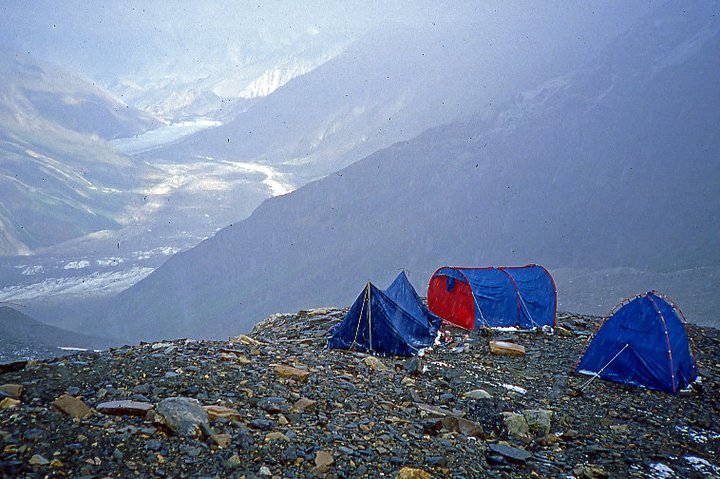 Al primo (e unico!) campo, installato stranamente per un C1 che si rispetti non ancora in vista della neve, ci svegliammo in un’alba livida fatta di nevischio. Sapevamo che le nuvole si sarebbero diradate per assicurarci una lunga mattinata fatta di sole prima del peggioramento pomeridiano o così come ci era sembrato osservare nei giorni precedenti.