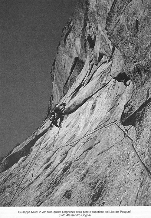 Dal ben noto Sasso Remenno procedendo verso San Martino Val Masino, se si guarda in alto, ci si accorge di essere dominati da un’enorme parete grigia, a triangolo liscio e solcato solo da fasce strapiombanti. É il Liss del Pesgunfi, un precipizio abbastanza tetro. Solo al mattino il sole indora quelle placche levigate, dando un po’ di colore ad un sogno per il resto assai sbiadito e uniforme. Sapevo di questo progetto vecchio di dieci anni e un giorno mi lasciai sfuggire con Popi una mezza provocazione: “E il Pesgunfi?”. Con ciò mi ero condannato a un lavoro forzato, ma ogni promessa e debito. Le rispettive esperienze alpinistiche si trovarono d’accordo. Un problema, che senso ha nel 1984? Quando pareti ben più importanti sono state salite, quando qualunque muro, se si usano i mezzi adatti, può essere salito e perfino può essere arrampicato in libera se si predispongono le protezioni a spit, per quale ragione vogliamo salire una parete che non é in alta montagna, che non è “il” problema, che richiederà una progressione decisamente artificiale? Non lo sappiamo, ma entrambi “sentiamo” che il Pesgunfi è lì per noi. Sappiamo che il suo eterno ambiente ci concederà per un attimo la visita della nostra vita. Non vogliamo compiere l’impresa. Siamo ma- turi e la nostra efficienza é naturale, senza essere sorretta da allenamenti e diete. Per questo motivo le nostre produzioni non sono concorrenziali. Non mettiamo perciò in vendita questo nostro “affaire” e stabiliamo che sarà anzi una salita di lusso. Non ci poniamo limiti di tempo e di mezzi. Ogni notte dovrà essere rigorosamente dormita in un letto e concludiamo che lo spreco di corde fisse non aumenterà per nulla i valori da capogiro dello spreco d’energia che si perpetua quotidianamente nel mondo intero. E l’alba di una bella giornata estiva quando risaliamo, carichi come cammelli, vaghi sentierini che conducono alla cengia di metà pare- te, al di sopra dei primi 250 metri saliti dieci anni fa. Un’occhiata in alto e poi isoliti rituali preparativi. Sono questi i momenti in cui la conferma di quanto stiamo avviando dovrebbe esserci data dalle sempre meno incerte sensazioni che si affacciano all’approssimarsi dell’azione. Credo di osservare e non posso farne a meno, e sento che mi succederà qualcosa, qualcosa di non grave. Devo impegnarmi su questa parete come si va ad un appuntamento del destino, ma non è un fato maligno quel- lo che incombe da questi tetti che ci sovra- stano e da quelle placche sfuggenti in alto: e piuttosto un pedaggio alla felicita. Gli aspetti esteriori di una grande salita californiana occorrono subito: recuperi di zaini e materiale, risalite del secondo a jumar. Alla terza lunghezza vado avanti io: Popi ha dei brutti ricordi del tetto del Rondone, ma oggi con l’aiuto dei friends tutto è assai meno complicato. Popi continua in un bellissimo diedro già chiodato fino a un piccolo gradino di sosta. Qui si arrestava il tentativo prece- dente. Una parete del tutto liscia ci costringe ad estrarre il perforatore e così ci alterniamo in un faticoso lavoro. Il timore dell’oscurità ci fa ritirare in tempo e scendere velocemente sulle corde fisse.