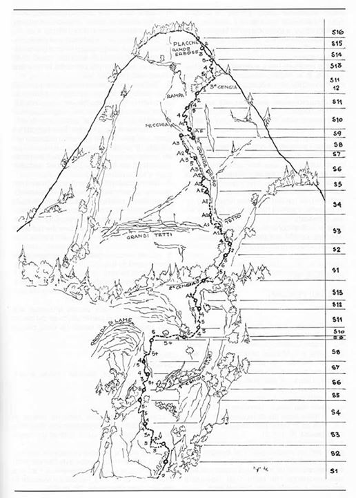 Dopo un pasto soddisfacente e una notte di buon sonno, la ripida salita fino alla cengia e un piacere. L’aria fresca del mattino, il carico più leggero, le piccole grandi cose del bosco e il silenzio addolciscono l’incombenza della grigia parete. Le corde pendono immobili nel vuoto e presto, uno dietro all’altro, siamo ben al di sopra delle appuntite cime delle conifere. Quel vago vuoto allo stomaco che ti prende quando lasci il regno orizzontale per assorbirti nel verticale sparisce ai primi raggi di sole: si scioglie come neve. Non ho ancora detto a Popi le mie incertezze del giorno prima e ora mi sembra tutto così naturale che mi lascio prendere dai miei stessi movimenti: faccio solo attenzione che nessuna manovra contenga qualche errore. In breve siamo al punto massimo, dove ci attende un ammasso di materiale di ben complicata soluzione. Saliamo ancora in artificiale ma usando tutti i piccoli accorgimenti per forare il meno possibile. Dopo alcuni passaggi emozionanti Popi raggiunge la quinta sosta, un gradino esiguo ed erboso sotto un diedro gigantesco e obliquo a sinistra. É il mio turno, la fessura di fondo è di dimensioni assai variabili, quasi certamente si potrebbe salire in libera ma la continuità dell’ostacolo ce lo sconsiglia. Il tempo passa in fretta, non me ne accorgo perché sono del tutto impegnato nel gioco di risalire questo stupendo diedro. In cima trovo un piccolo terrazzino con una pianta, un punto di fermata naturale. Popi mi raggiunge dopo il consueto lavoro di pulizia e di sistemazione della corda fissa. Decidiamo di scendere perché e già tardi.