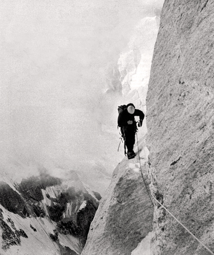 Sebbene ogni giorno fossimo sfiniti, tuttavia il nostro lento procedere ci dava come una calma e serena speranza di vittoria. Raggiungemmo il tratto di parete rocciosa più liscio e verticale, dove l’arrampicata fu estremamente dura e complessa. Più volte dovemmo pendolare oppure attraversare a corda delle sezioni di placche assolutamente levigate, per raggiungere nuovamente dei sistemi di fessure percorribili o dei diedri. Pete attraversò a corda una svasatura fuori dalla mia visuale ‘e forzò poi direttamente un passaggio lungo delle fessure che aveva trovato. Per tutto quel giorno rimasi al posto di secondo in cordata. Ciascuno di noi saliva per due lunghezze di corda successive da primo di cordata, prima di dare il cambio all’altro, ma quel giorno fu interamente speso a salire quelle sole due lunghezze di corda. Il giorno successivo ripresi il comando, ma ancora non riuscii che a superare due sole lunghezze. Con un’altra traversata a corda ancorata ad un misero chiodo a lama di rasoio, riuscii a raggiungere un diedro strapiombante, ma la fessura posta sul fondo era ancora fuori dalla mia portata. Cominciai lentamente a pendolare su e giù cercando di allungarmi al massimo, mentre le corde sfregavano sinistramente sul bordo tagliente del diedro, sperando di farcela prima che si tagliassero…