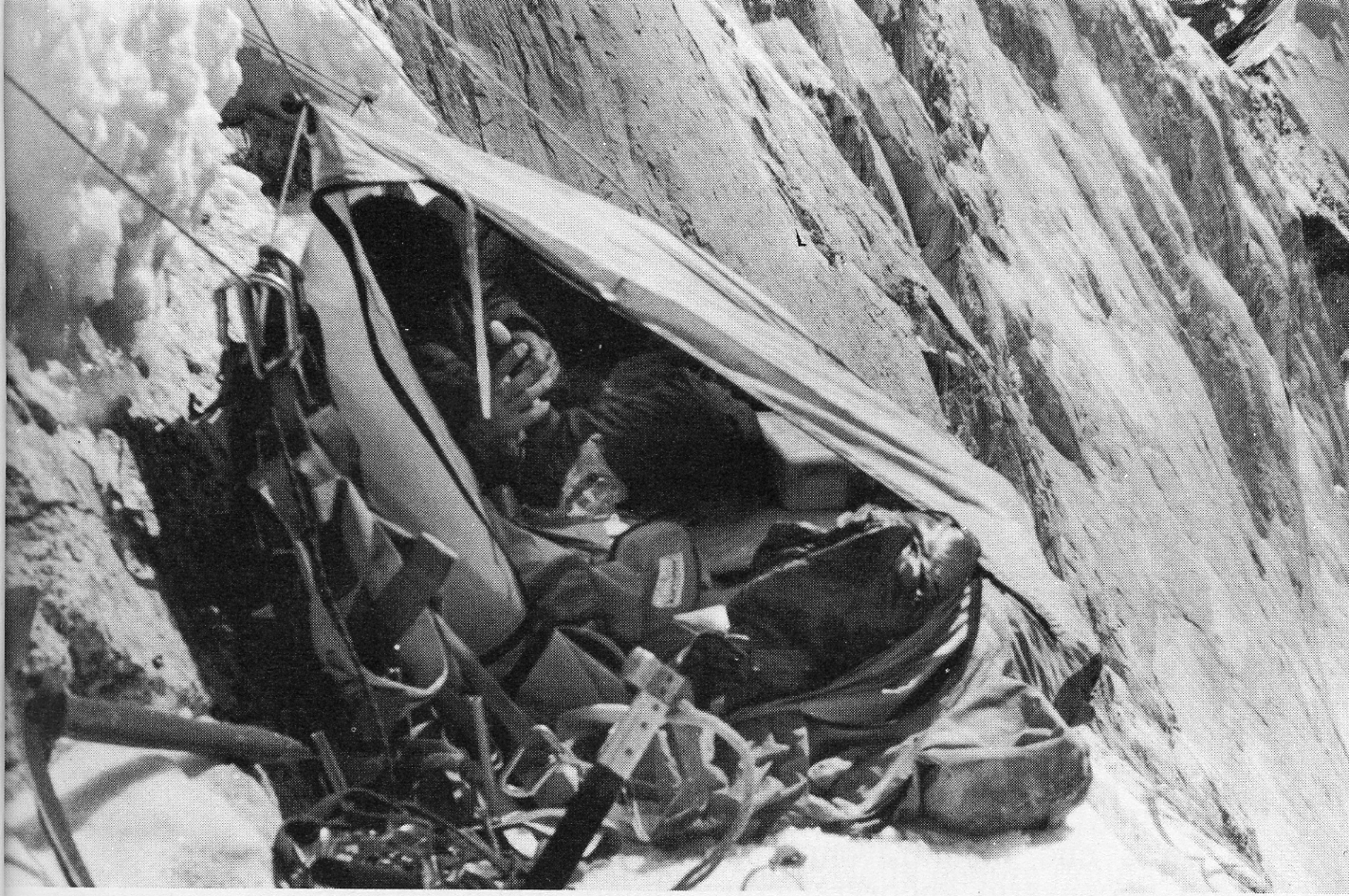 Il giorno finì con una bufera di neve, nebbia fitta e vento del boia. Ridiscendemmo alla tenda e quella notte ci rendemmo conto che la nostra attrezzatura era forse insufficiente. Tuttavia sentivamo che a poco a poco ci stavamo acclimatando e cercammo di forzare i tempi, tentando di alzarci più presto il mattino, esattamente alle otto. Ma anche così non riuscivamo ad avanzare durante la giornata che di tre lunghezze di corda, a volte anche meno. Le calate in corda doppia sulle corde fisse di 8 millimetri e le risalite delle stesse con le jumars davano una tensione nervosa estrema, soprattutto dopo che un chiodo uscì fuori mentre Pete saliva, causandogli un volo di sette metri. A tutti i costi mi sforzai di trovare un controllo e cercai di reprimere la mia immaginazione sconvolta, altrimenti non avrei più trovato la forza di fare un passo. Raggiungemmo il nevaio di ghiaccio, il quinto giorno dal Campo 1. Ci spronava un «morale» enorme e cominciammo a credere che forse ce l’avremmo fatta, pur trovando lungo tutto il necessario. Prima di trasportare i rifornimenti fino al termine delle corde fisse, ci fermammo un po’ al Campo 1, ma il giorno successivo nevicava da matti e così ce ne ritornammo al Campo Avanzato e poi al Campo Base, per non consumare le provviste lasciate in parete. Lontano dalla montagna, osservando la sezione superiore, liscia, verticale, quasi senza punti deboli di salita, tornarono a galla tutti i dubbi e le ansie represse. Era meglio combattere direttamente con le difficoltà, piuttosto che esaminarle da lontano. Ritornammo in parete con delle amache speciali da bivacco, tirandoci su per le corde fisse fino a raggiungere il punto più alto. Tutto ciò ci prese tempo ed il buio ci colse quando ancora non eravamo a metà strada. Forniti delle amache, potevamo fermarci dove volevamo, ma le condizioni del tempo sembravano peggiorare ancora. Cercammo di cucinare qualcosa prima di infilarci nelle amache, che erano protette con dei teli contro il vento e le continue colate delle slavine. Fu una di quelle notti che non finiscono mai e che non si dimenticano. Gli ancoraggi speciali a sbarra che avevamo preso per tenere le amache aperte e distese durante il bivacco, erano su al termine delle corde fisse, con tutto il rimanente dei viveri, che erano già stati issati fin là in precedenza. Così, ci sentivamo annientati ed impotenti, rattrappiti e desiderosi di veder sorgere il mattino. Ma temevamo il suo giungere, poiché avremmo dovuto arrampicare in balia di un vento freddo e tagliente. Rimettere gli scarponi fu penoso e richiese lo sforzo maggiore. Fissavo Pete, che si raggomitolava nel tentativo di scaldarsi le mani. «Sono un pezzo di ghiaccio!» «Non preoccuparti, non ho nessuna intenzione di ritirarmi… !». Giungemmo al termine delle corde quello stesso giorno, avvolti da una nebbia lattiginosa. Nostra prima preoccupazione fu quella di bere e mangiare qualcosa. Eravamo in condizioni troppo disastrose per poter avanzare ancora quel giorno. Sciupammo un’intera scatola di fiammiferi tentando di accendere il fornello. Dopo due ore, rannicchiati su un minuscolo gradino di ghiaccio, proteggendo con i corpi il fornello, riuscimmo a prepararci qualcosa da bere ed anche una tiepida zuppa liofilizzata. Avevamo bisogno di ben altro, ma intirizziti e semicongelati non riuscivamo più a restare in quella posizione insopportabile. Piazzammo le amache ed i teli e ripetemmo lo squallido e goffo rituale che già avevamo compiuto per potervi entrare e per infilarci nei due sacchi-piuma che erano indispensabili per proteggerci dal freddo notturno.